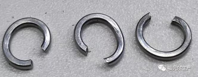 4、彈簧墊圈的切口毛刺:由于加工工藝的原因,切斷面后的彈簧墊圈切口處肯定存在或大或小的毛刺,彈簧墊圈經(jīng)過熱處理后,這些帶有較高硬度的毛刺或?qū)⒅苯忧度肫綁|圈或被連接件機體中,導致螺栓螺母擰緊過程中彈簧墊圈拉長而墊圈失效。
