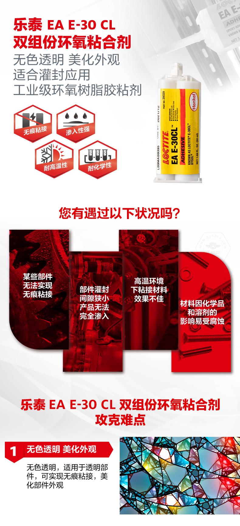 樂泰EA E-30 CL雙組份環(huán)氧粘合劑是一款無色透明的工業(yè)級環(huán)氧樹脂膠粘劑。樂泰EA E-30 CL雙組份環(huán)氧粘合劑適用于透明部件,可實現(xiàn)無痕粘接,美化外觀。樂泰EA E-30 CL雙組份環(huán)氧粘合劑低粘度、滲入性強,能夠有效滲入小間隙并填充縫隙,適合灌封應(yīng)用。樂泰EA E-30 CL雙組份環(huán)氧粘合劑還具備耐高溫性和耐化學(xué)性,可用于玻璃、光纖、陶瓷、金屬和許多硬質(zhì)塑料的粘接。